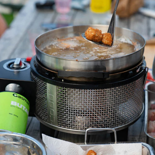 A Complete Outdoor Kitchen. The COBB Grill Gas Bundle includes everything you need for hassle-free outdoor cooking anywhere. It's all your cooking needs in one compact & powerful unit, allowing you to save space & cook more. Featuring the best-selling portable COBB Grill Gas and our most popular accessories—wok, frying pan, griddle+ & roast rack—this bundle gives you the tools to cook just about anything, anywhere. From grilling and roasting to frying, baking, steaming and boiling, your outdoor cooking options are endless. Perfect for the boat, camping, beach cook ups & any outdoor adventure.