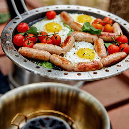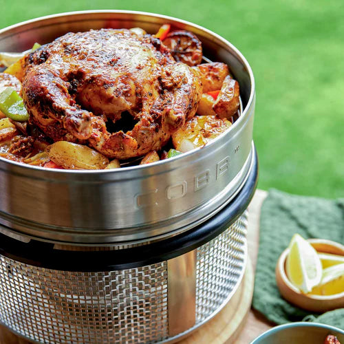 It's all your charcoal cooking needs in one compact & powerful unit, allowing you to save space & cook more. Featuring the award winning charcoal fuelled COBB Grill Air and our suite of cooking accessories, this bundle gives you the tools to cook just about anything, anywhere. From grilling and roasting to frying, baking, steaming and boiling, your outdoor cooking options are endless. Fuelled using our coconut based Cobblestones charcoal or standard briquettes.