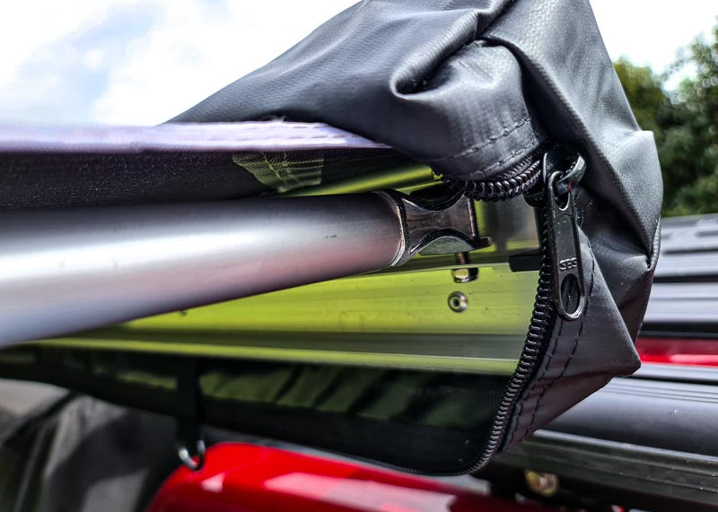 Attach one to the side of your vehicles roof rack and she's all go, with a quick and easy set up! Unzip, roll out, drop down poles and secure with the provided guide ropes and pegs.